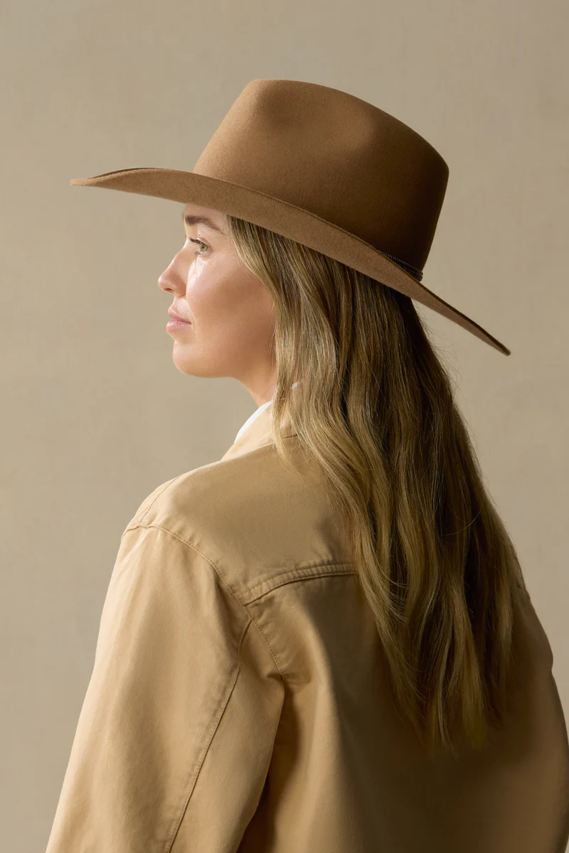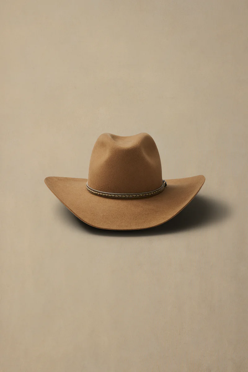 Introducing the Dusty Dawn – a statement hat inspired by the expansive beauty of the wide-open West. Featuring a bold Western-style crown, generous wide brim, and a distinctive equestrian-inspired band, this design effortlessly blends rugged frontier style with timeless sophistication. Perfect for the trail, the paddock, or styled for modern everyday wear, the Dusty Dawn is where tradition meets adventure.