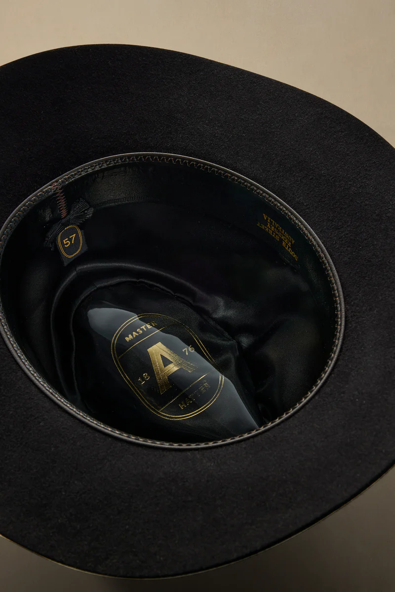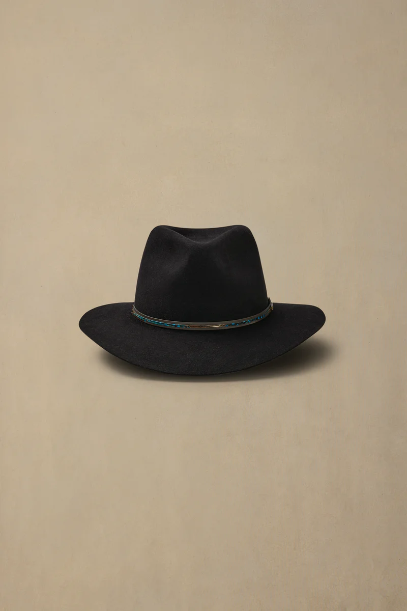 Features:- 70mm brim width- 104mm crown height- Pinched teardrop shaped crown- Satin lining- Leather inner sweatband- Bonded leather band with feather inserts- Cut edge