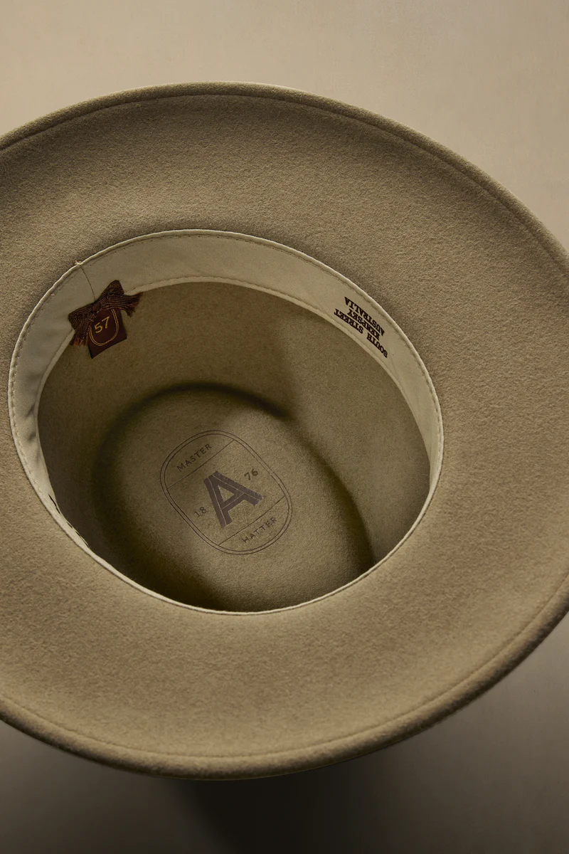 Features:- 76mm brim width- 120mm crown height- Pinched teardrop shaped crown- Unlined- Buckram inner sweatband- Leather outer band with brass pin- Bound edgeSize Range: 53 - 63Note: Colour of hat may vary slightly from the picture.