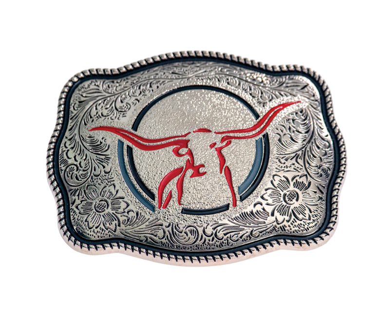 Longhorn Buckle - Red Enamel Detail on Silver Base - Size 10cm x 7.0cm