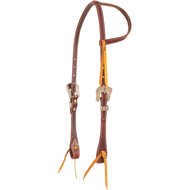 Chestnut skirting leather with buckles and bit ties. Slip Ear Stitched headstall.