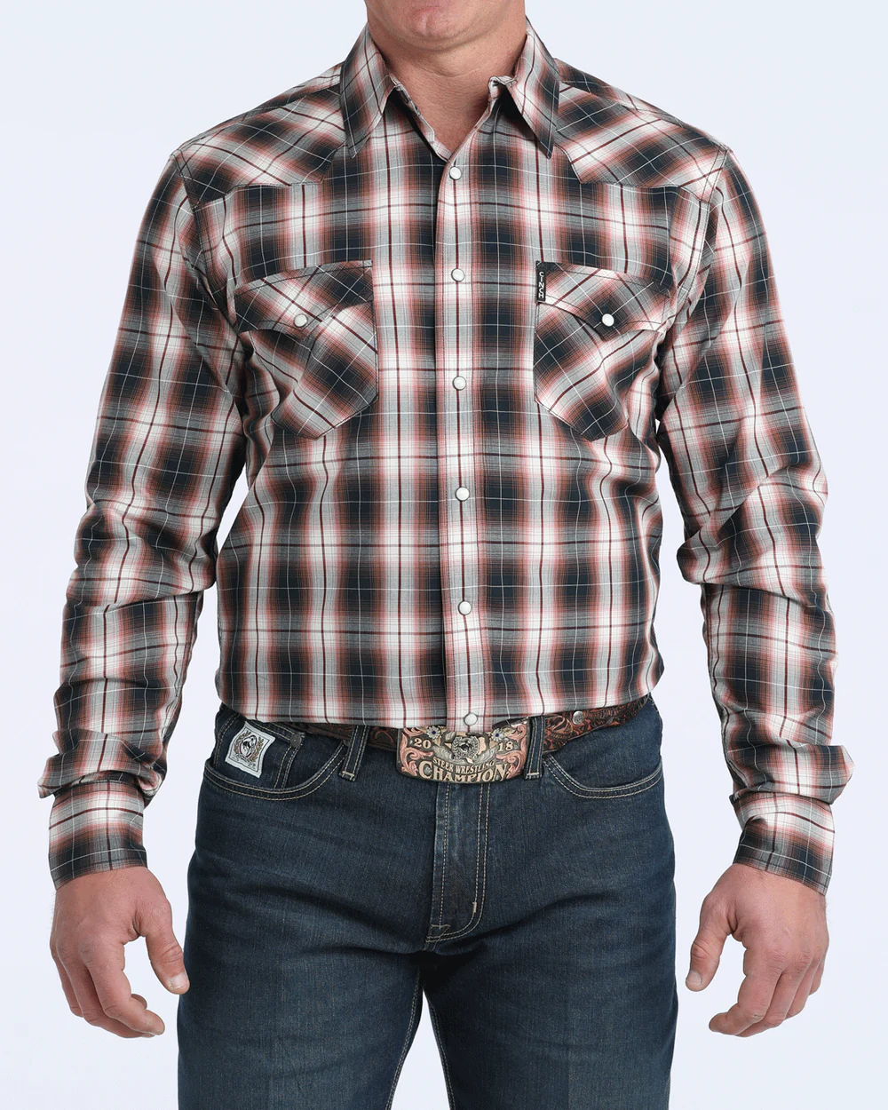 Made for life on the range or off the clock, this Modern Fit multicolor plaid Western shirt delivers cowboy style with lasting comfort. Built from durable cotton plain weave, it features contrast topstitch, a traditional spread collar, CINCH logo embroidery, and cream marble snaps for an authentic finish. A true everyday essential for the man who lives and works the Western way.