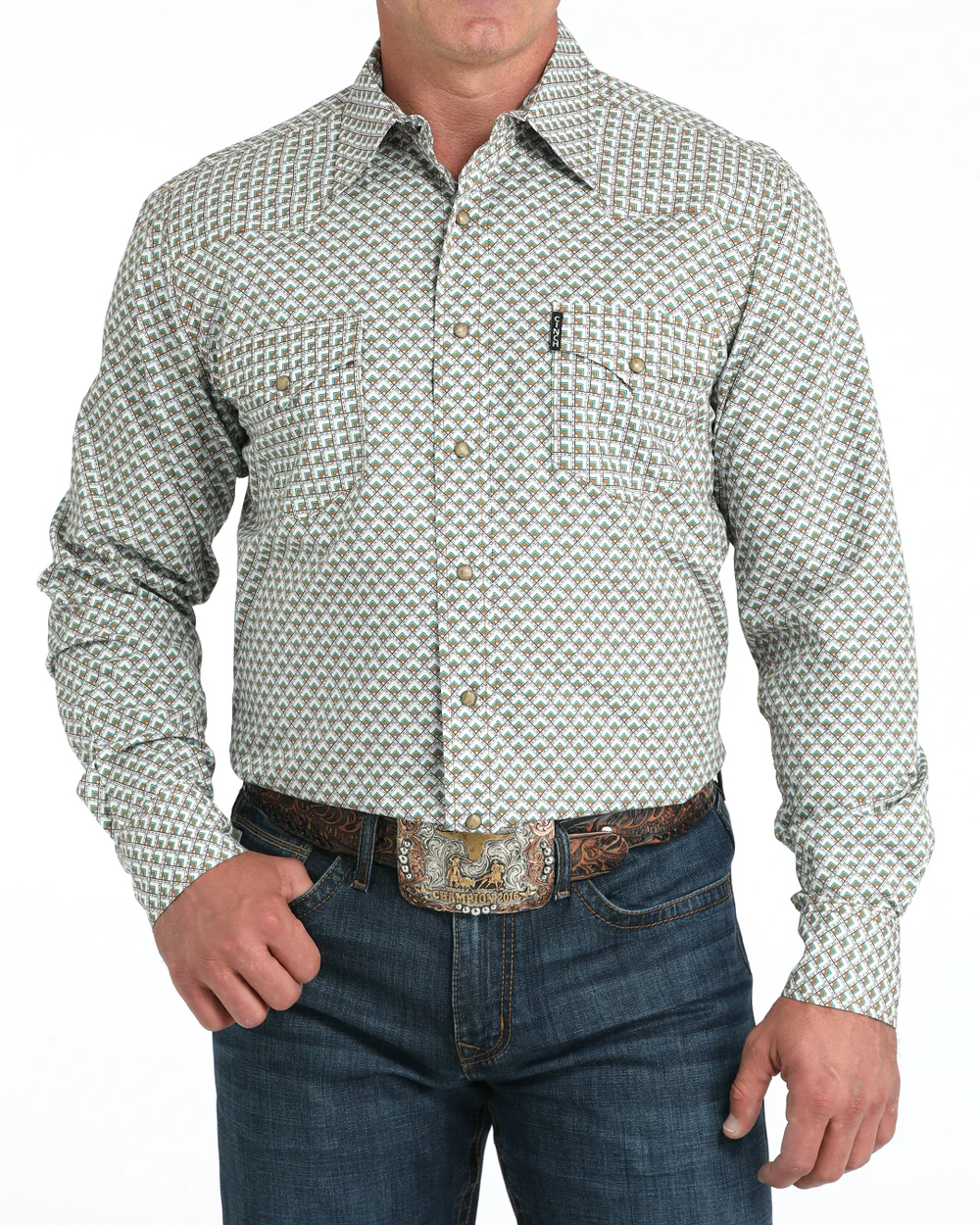 Cinch Men's Shirt Modern Fit Snap Button Geometric Print White MTW1303093 WHT