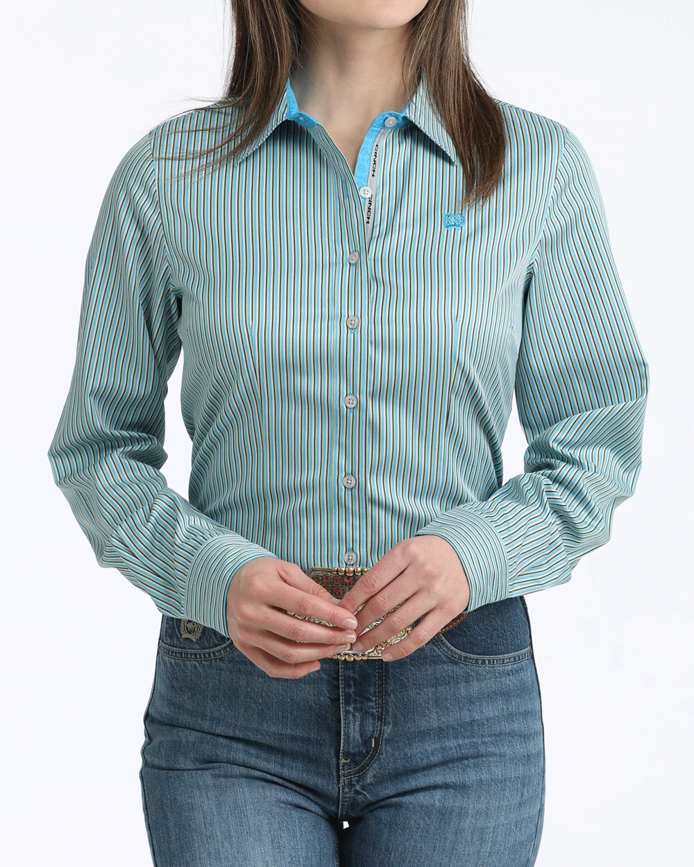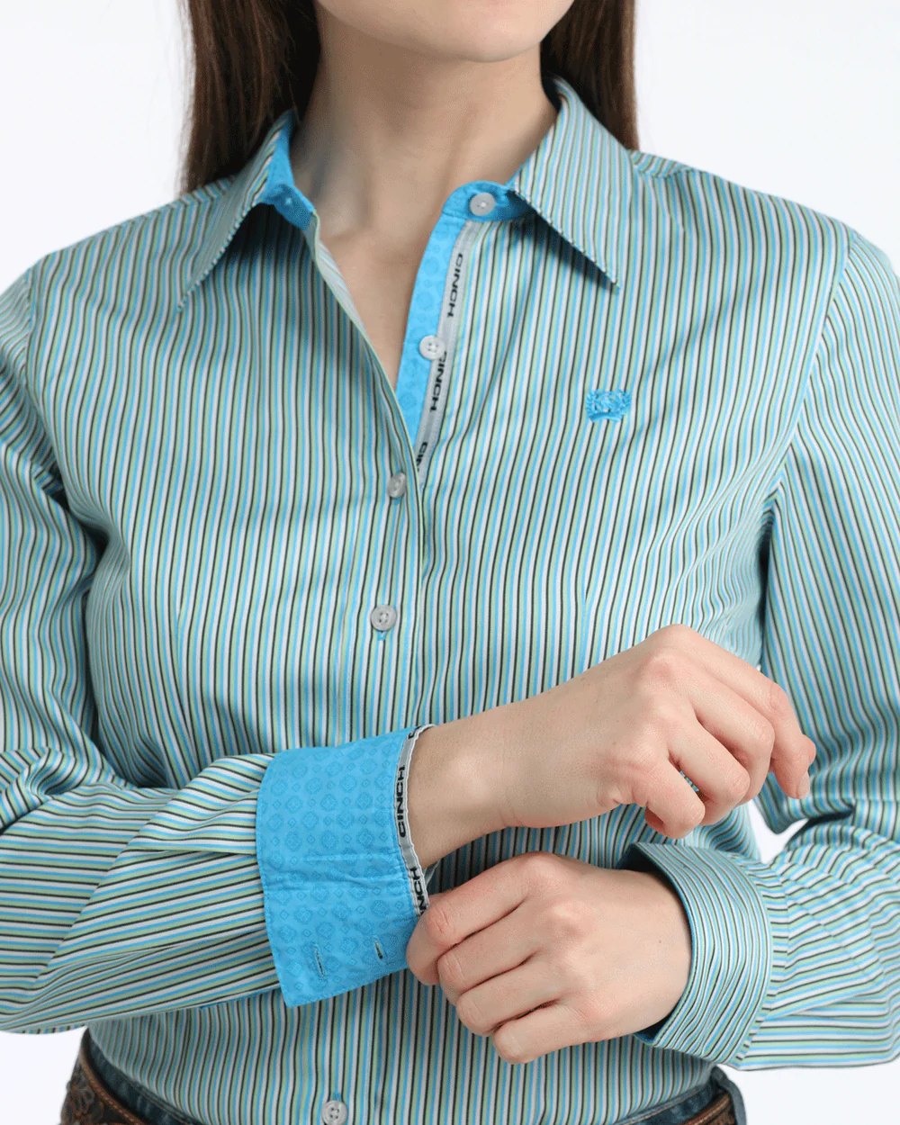 - Made for her, this blue poly/Tencel/cotton twill weave stripe shirt delivers a soft, durable feel with just the right amount of stretch. Designed with bright blue contrast trim, a spread collar, an open left front pocket with embroidered CINCH logo, and white buttons, this shirt combines classic style with modern comfort and a flattering feminine fit.