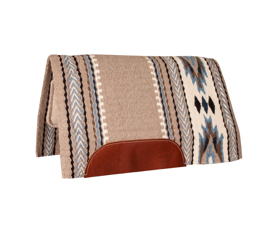 Custom designed 100% New Zealand wool blanket top with a half inch felt Centre and a half inch tan wool bottom. Top grain wear leathers.