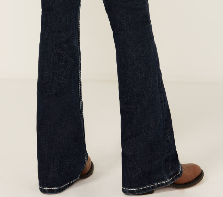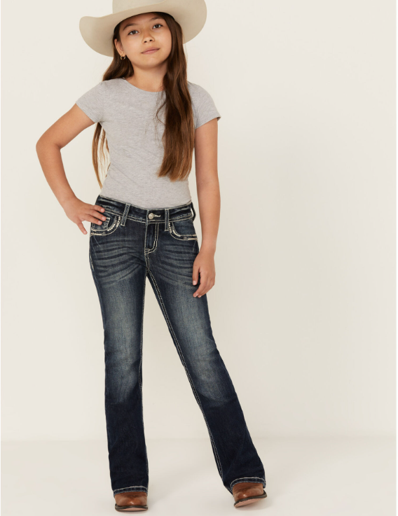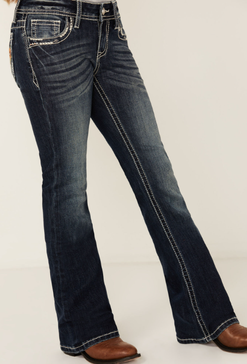 Zip-fly with button closure5 pocket stylingDark washBootcut leg with finished hemsWhiskering and hand sanding detailsHorsehead with horseshoe and flower design on back pocketsHand wash coldImportedModel is 4'5" wearing a size 1064% cotton / 35% polyester / 1% elastaneStyle: GBS722