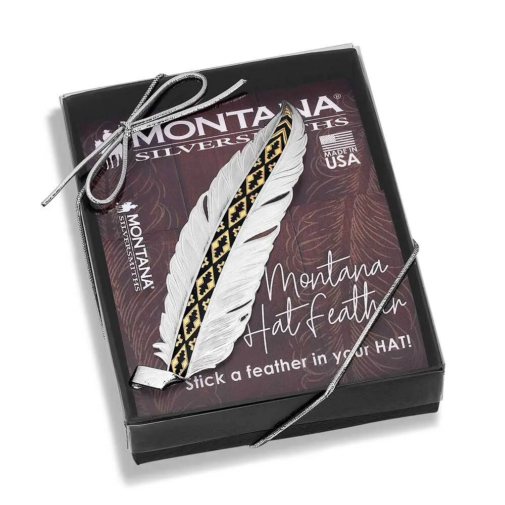 Add a bold accessory to your hat with the Trust and Honor Hat Feather. This two tone hat feather features a bright silver finish that creates the feather design. Through the center vein is a gold tone with a bold Southwest design that is made to stand out with deep black paint.
