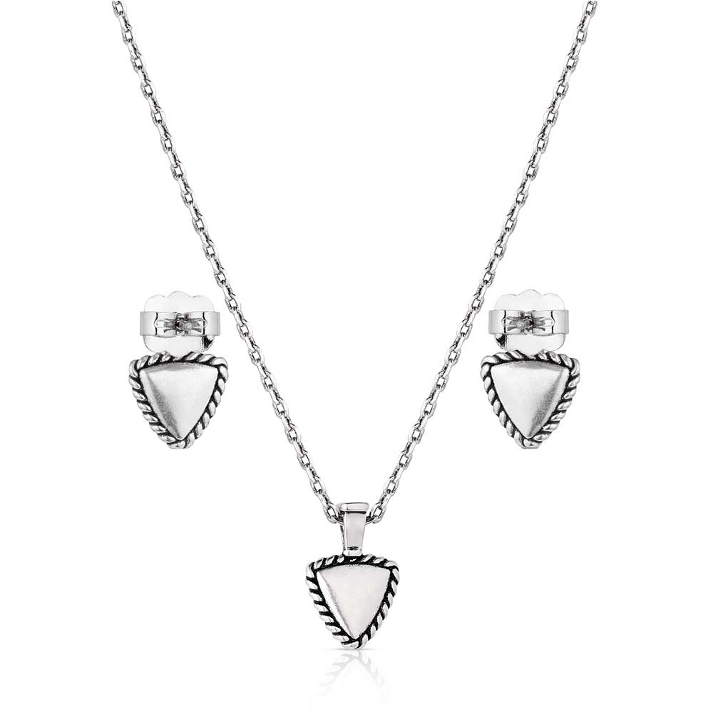 This jewelry set was made to take on any adventure. The simple necklace in this set features a triangle shaped turquoise pendant. A silver tone roped border completes the design. The necklace has a 19 inch adjustable cable chain. The earrings have hypoallergenic post back wires. Stone color may vary.