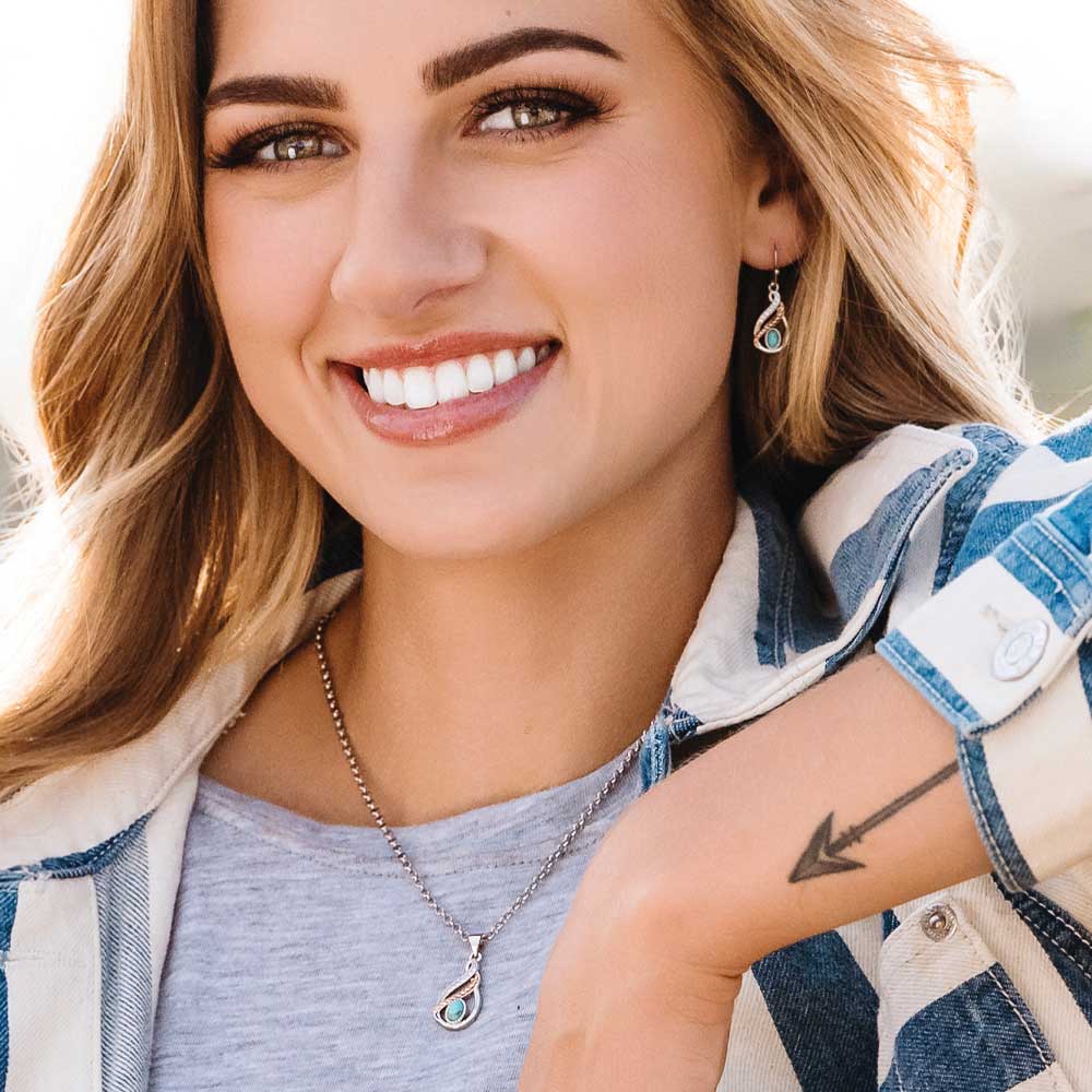 This necklace and earrings combo is what dreams are made of. The necklace in the set features a vibrant oval turquoise stone. A silver tone tear drop shape design encloses the turquoise stone. Seven clear cubic zirconia crystals fill the top left side of the tear drop design. A captivating rose gold tone rope design sits just above the turquoise stone. The earrings in the set match the design of the necklace. This necklace has a 19 inch adjustable rolo chain. The matching earrings have hypoallergenic post back wires. Stone color may vary.