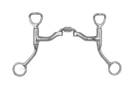 The 5" HBT shank is stainless steel and slightly curved back, with a flat-top purchase and a rein ring. The mouthpiece has a fixed attachment. The HBT shank has the patented Independent Swivel Cheek, where the purchase, mouthpiece and shank all move independently of each other. The purchase is slightly angled away from the cheek to avoid rubbing. It has an indirect (curb) rein action designed to be used with a curb strap which attaches to the purchase. The HBT shank uses the combination of the fixed cheek and fixed rein to apply pressure to the mouth, chin and poll.
