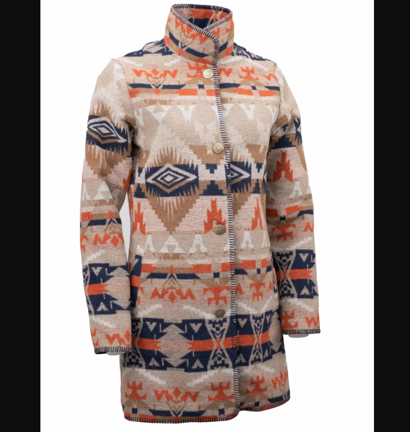 The Moree Jacket is a stunning fall-ready layer that combines classic western charm with bold style. Crafted from a beautiful wool-like tapestry fabric, it features whipstitch detailing, a button-front closure, and functional hip pockets—perfect for turning heads all season long.