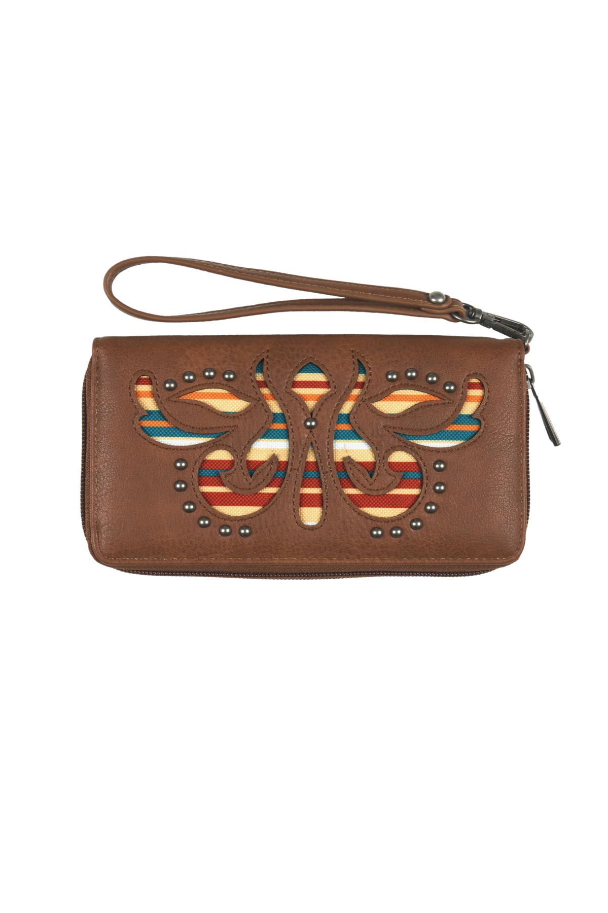 Cut out design with inlay, stud detail, removable wristlet, 8 x card slots, 2 x note pockets, internal zip pocket, pure western metal badge, RFID PROTECT technology protects your credit cards from fraud and identity theft