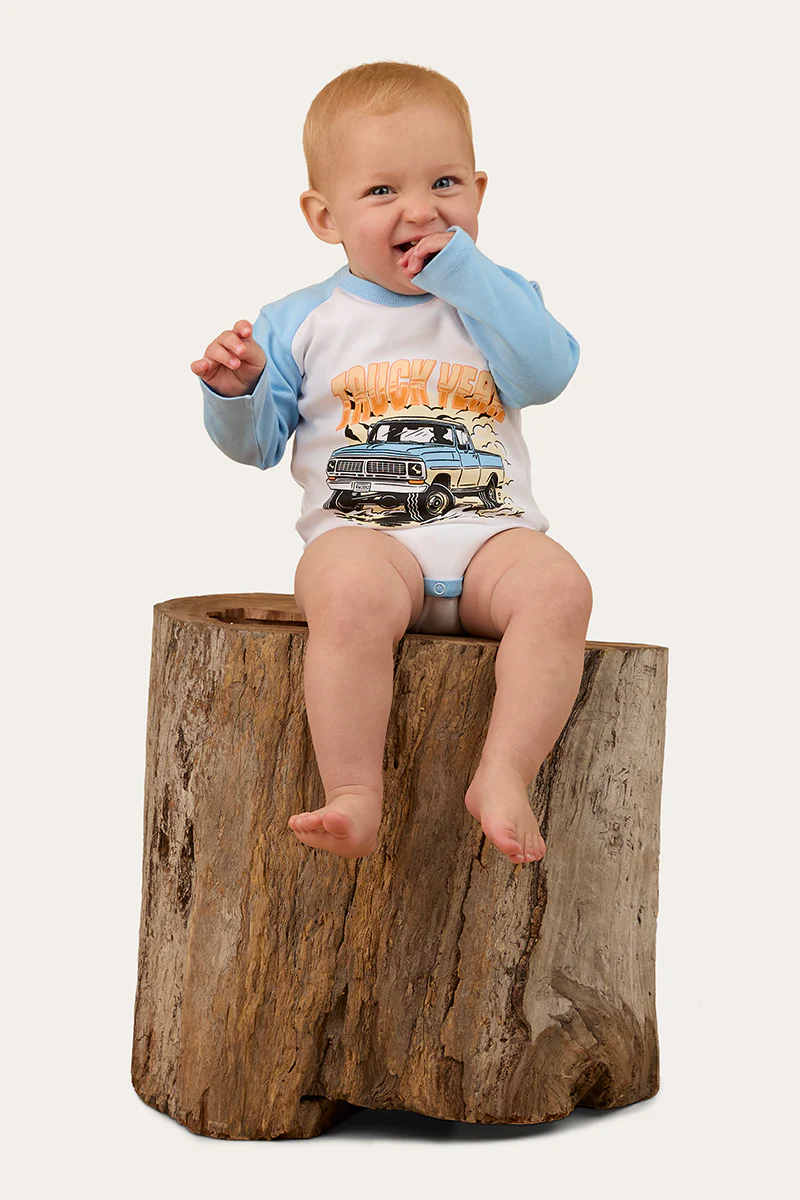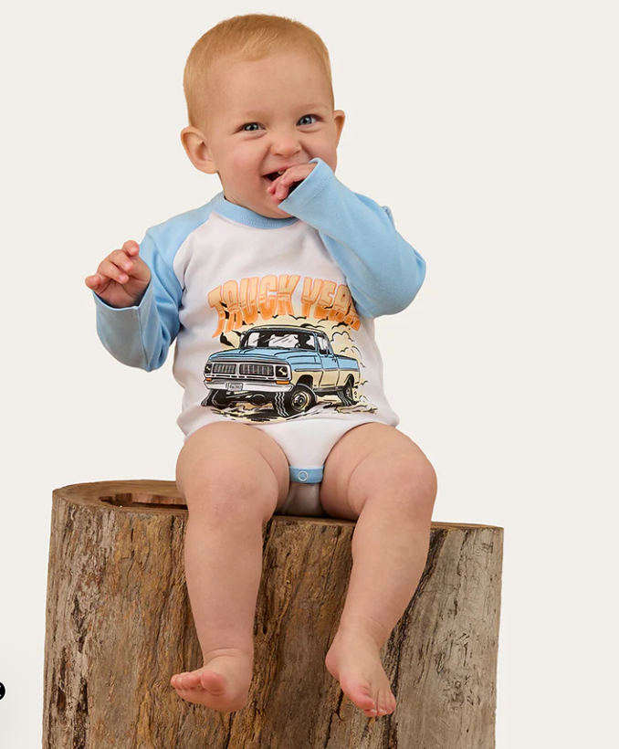 Made from 100% cotton with a super soft handfeel, this breathable, relaxed-fit romper is built for all-day comfort and easy movement. Long sleeves provide extra coverage for cooler days, while contrast neck binding and sleeves add a timeless western touch. A bold centre-front truck graphic brings classic country character, finished with a subtle signature circle logo at the back for unmistakable Ringers Western authenticity.