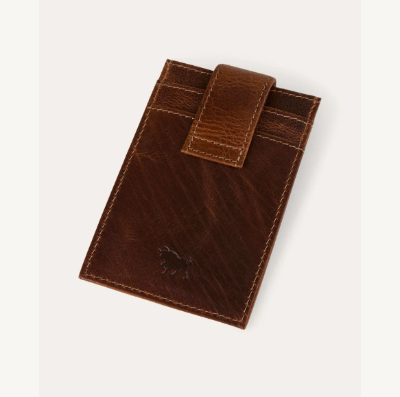 With a streamlined, minimalist design, the Toro Card Clip delivers confidence and convenience. Featuring five card slots, a secure button closure, and RFID-lined protection, this slim leather card holder keeps your essentials safe without the bulk. Finished with contrast stitching and a signature Ringers Western brass coin accent, the Toro blends luxury craftsmanship with everyday practicality.