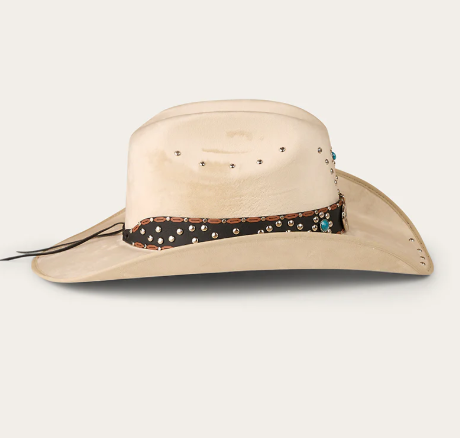 Featuring the classic Cheyenne crown, the Kassidy is structured for a secure and confident fit whilst the retro bow and brim further celebrate the iconic western silhouette. Decorative studs accentuate the rich leather hat band, continuing seamlessly along the brim and the crown for a striking, cohesive design. The thoughtful wide structured brim offers superior sun protection, making it the ideal companion for summer festivals, beach days, or everyday western wear. An internal elasticated hat band ensures a snug, comfortable fit for all-day wear, making the Kassidy Western Hat your go-to accessory whenever you want to stand out in style.