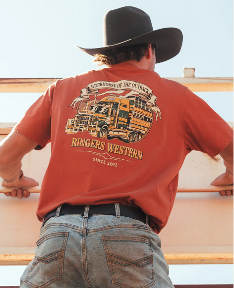 Crafted from 100% Cotton jersey, this soft and breathable tee will keep you cool and comfortable for the long haul. Designed with extra room in the chest, waist and hips, the Workhorse is perfect for those who like room to move. The classic crew neck adds a clean and timeless finish, while a signature Ringers Western graphic celebrates the Workhorse's of the outback.
