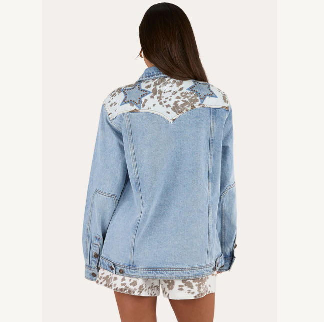 Crafted from 100% cotton, rigid denim, the Hoedown Jacket drapes effortlessly in an oversized fit, offering comfort and cowgirl charisma. Classic front chest pockets meet bold back detailing: a cow print yoke adorned with star appliques with stud detailing, giving this jacket its distinctive western charm.
