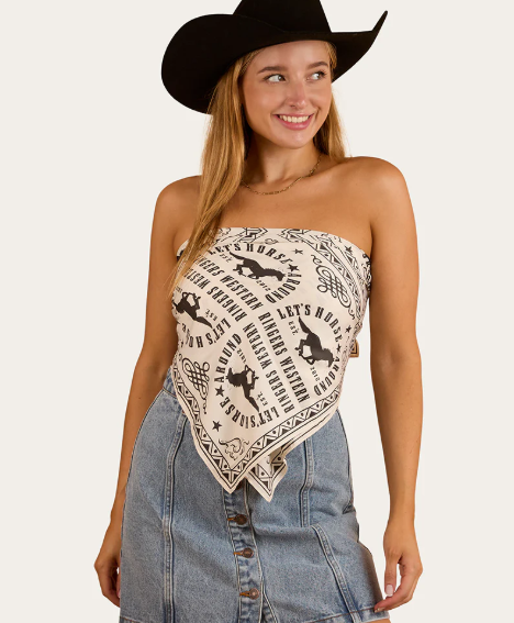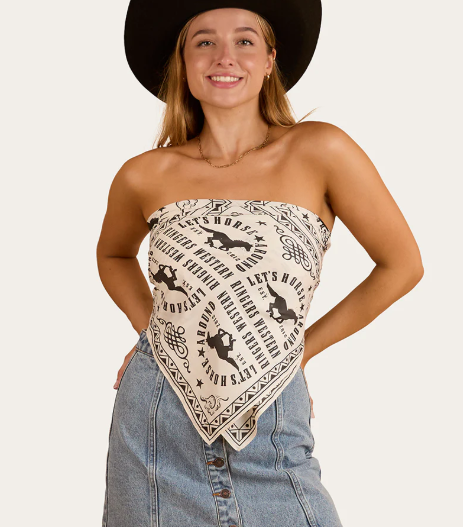 Crafted with the spirit of the country in mind, this charming scarf top features a equine-inspired print that celebrates freedom and fun. The neutral colour palette allows for effortless styling, pairing perfectly with denim hues. This versatile garment can also be worn as a hair tie or a neck scarf, catering to both function and fashion - an essential for the fun loving cowgirl.