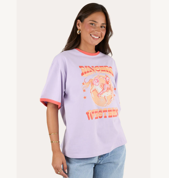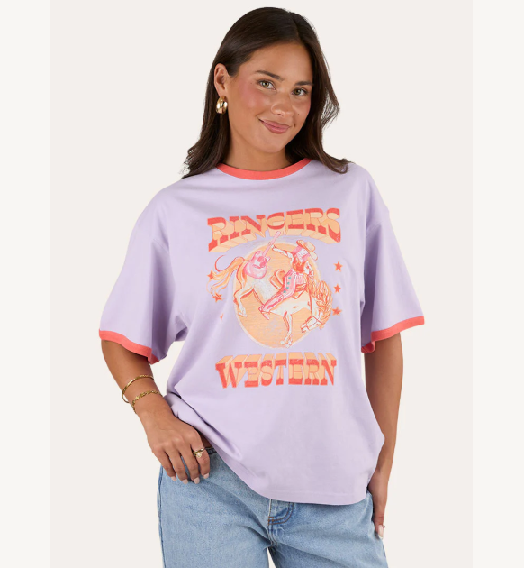 Designed for the modern country woman, this women’s graphic tee delivers all-day comfort, softness, and breathability. The oversized fit adds a relaxed, modern twist, draping effortlessly for casual style. Pre-shrunk to maintain its shape wash after wash, this durable tee is made to last season after season. A signature Ringers Western front graphic celebrates rodeos and country music, complemented by contrast neck and sleeve binding for a pop of colour.