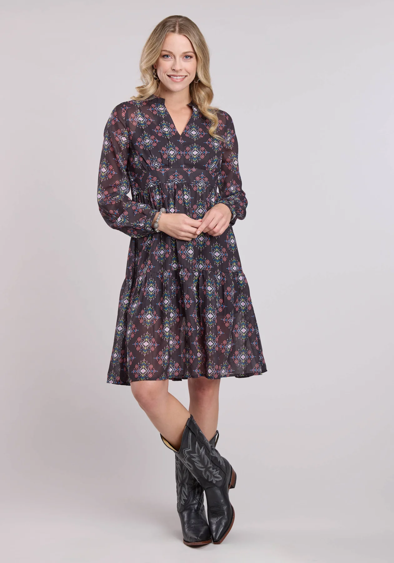 Women's Pretty Peasant Dress In "Aztec Brights" Printed Poly GeorgetteWide Waistband And Two Tier Gathered SkirtV-Neck With Banded CollarBlack Knit Poly Slip Dress Lining100% POLYESTERPRINTED - POLY GEORGETTE AZTEC BRIGHTSWovenPullover03-057-0590-7065 BL