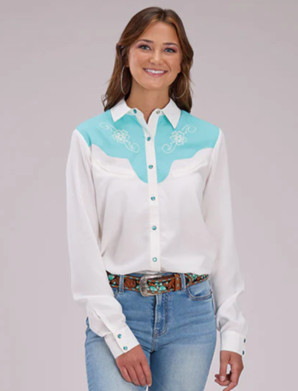 Women's Long Sleeve Western BlouseContrast Curvy Front & Back YokesFaux Smile Pockets2 Snap CuffSnap ClosureEmbroidery Decoration100% RAYONPIECE DYEDWoven2 PocketSnap03-050-0565-4075 WH