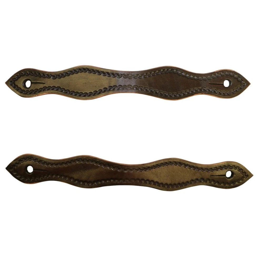 Dark brown slobber straps with an attractive pattern stamped into the leather. Use slobber straps to attach your reins to the bit.